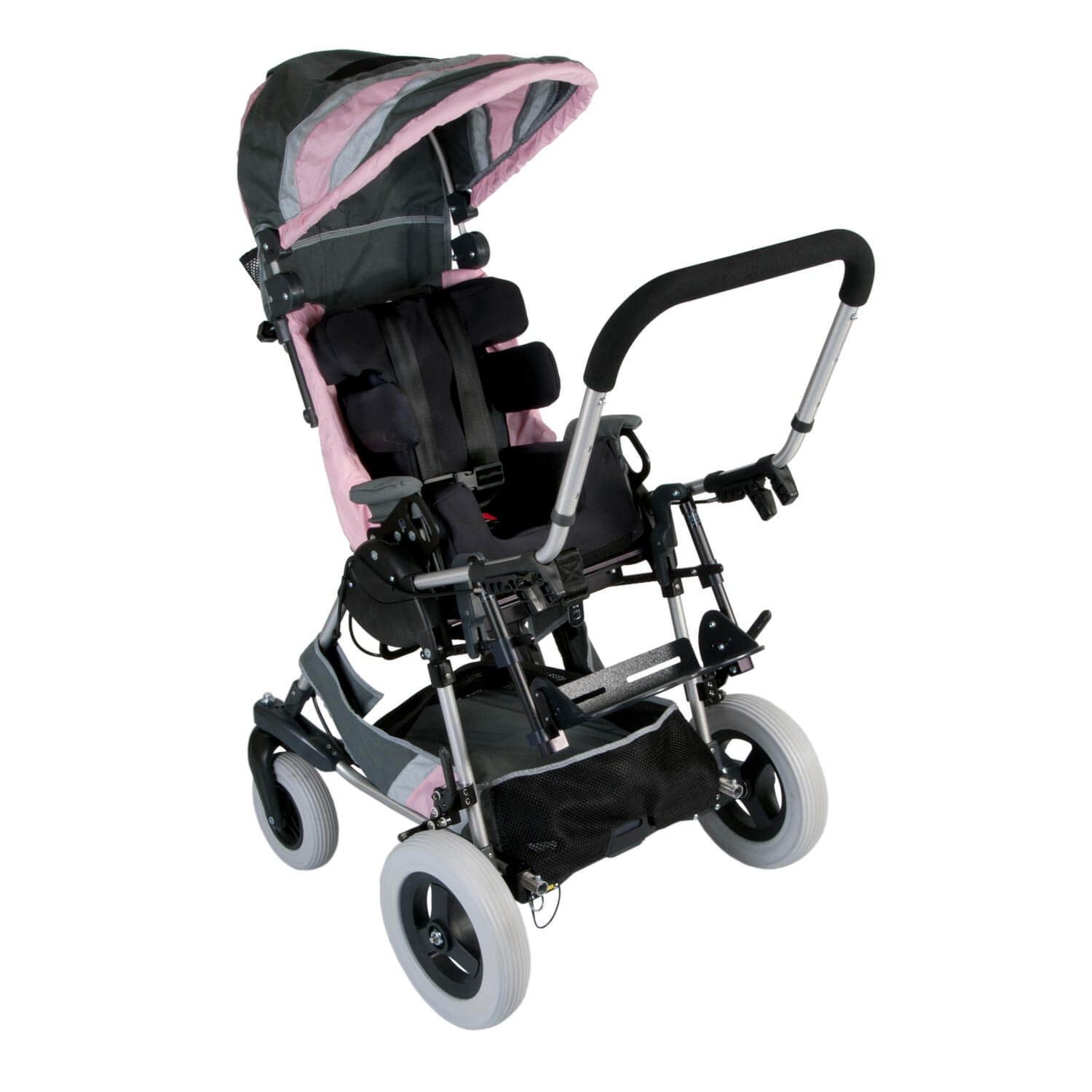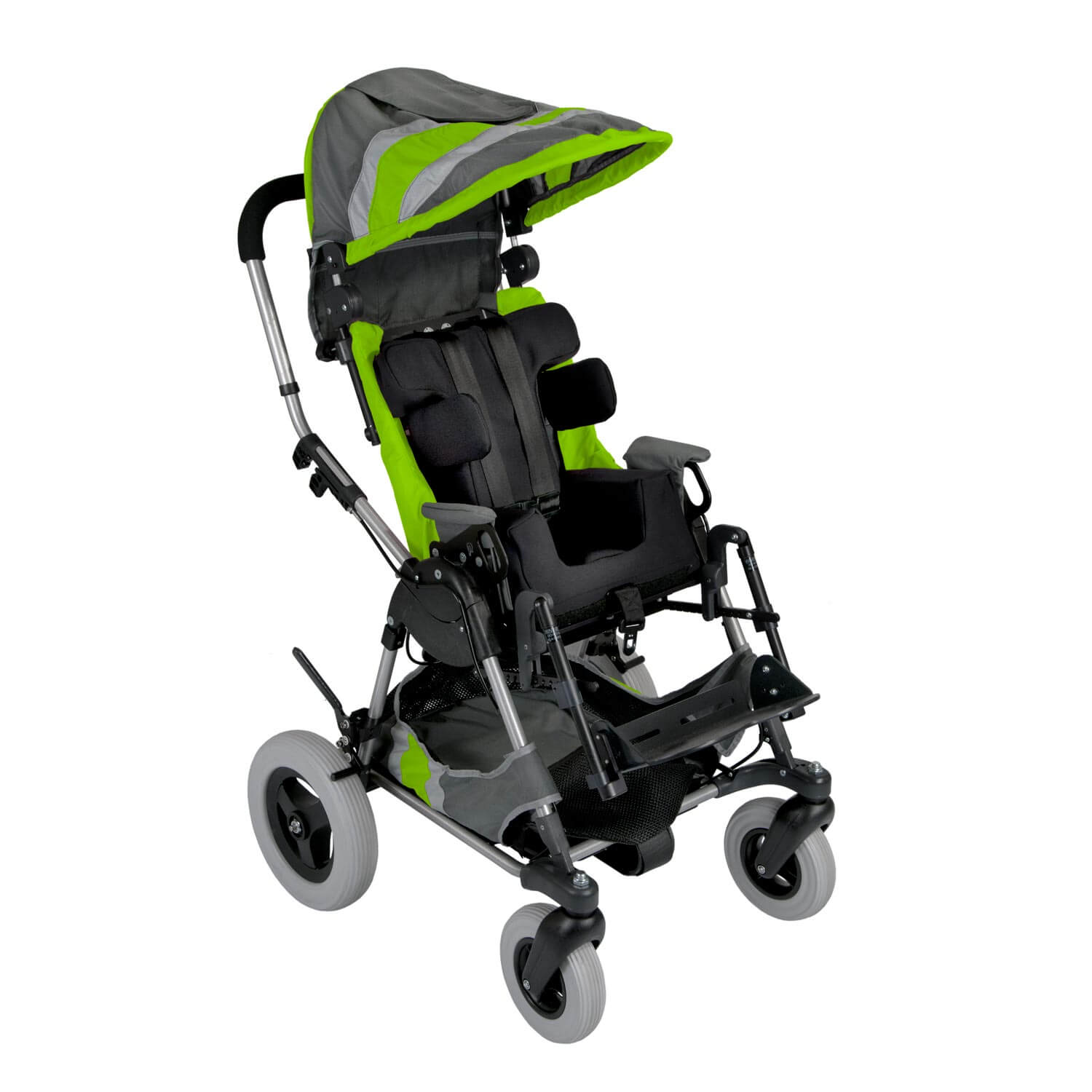 With 20° of forward tilt and 45° of rearward tilt, the KID-KART Xpress kids stroller features a 65° adjustable tilt range for superior positioning capabilities. Rearward tilt assists with feeding and respiratory function, improves visual orientation, and helps infants and toddlers hold their heads upright. Forward tilt may help babies and toddlers achieve important developmental milestones such as bringing their hands to their mouths or reaching for objects.